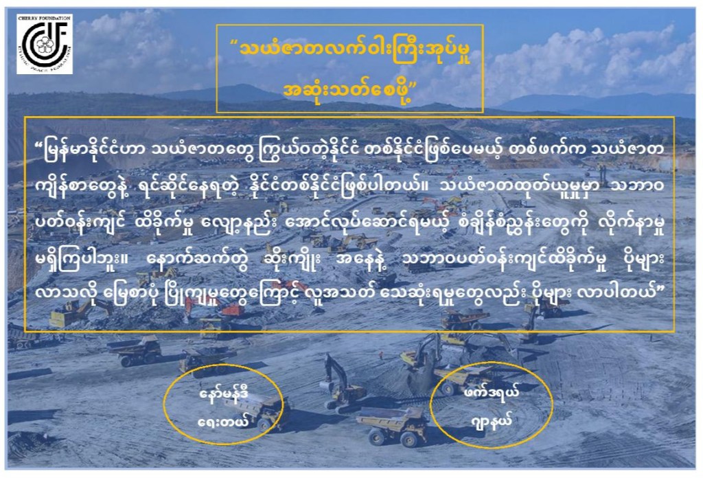 မြန်မာနိုင်ငံဟာ သယံဇာတတွေကြွယ်ဝတဲ့နိုင်ငံတစ်နိုင်ငံဖြစ်ပေမယ့် တစ်ဖက်ကသယံဇာတကျိန်စာတွေနဲ့ ရင်ဆိုင်နေရတဲ့ နိုင်ငံတစ်နိုင်ငံဖြစ်ပါတယ်။ သယံဇာတထုတ်ယူမှုမှာ သဘာဝပတ်ဝန်းကျင် ထိခိုက်မှုလျော့နည်းအောင်လုပ်ဆောင်ရမယ့် စံချိန်စံညွှန်းတွေကို လိုက်နာမှုမရှိကြပါဘူး။ နောက်ဆက်တွဲဆိုးကျိုးအနေနဲ့ သဘာဝပတ်ဝန်းကျင်ထိခိုက်မှု ပိုများလာသလို မြေစာပုံ ပြိုကျမှုတွေကြောင့် လူအသတ်သေဆုံးရမှုတွေလည်း ပိုများလာပါတယ်။