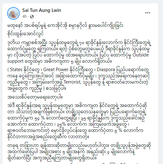ဒုတိယ ကမ္ဘာစစ်အပြီး သူပုန်ထမှုတွေရဲ့ ၇၀ ရာခိုင်နှုန်းလောက်က နိုင်ငံကြီးတွေရဲ့ ထောက်ပံ့မှုတွေ ရကြတယ်။ ရတဲ့ ပုံစံတွေမတူပေမယ့် ဒီရာခိုင်နှုန်းက သူပုန်ထမှုမှာ လိုအပ်တဲ့ ပြင်ပ ထောက်ပံ့မှု ထဲအရေးပါတယ်။ ပြင်ပ ထောက်ပံ့မှု Outside support တွေထဲမှာ အဓိကကျတာ ၅ မျိုး လောက်ရှိတယ်။ ( States နိုင်ငံတွေ ၊ Great Power နိုင်ငံကြီးတွေ ၊ Diaspora ပြည်ပရောက်တွေကနေ ငွေကြေးအပါအဝင် အခြားထောက်ပံ့မှုမျိုး ၊ ဒုက္ခသည်အရေးကနေတဆင့် ကူညီမှုတွေ ၊ အကြမ်းဖက်အဖွဲ့ Terrorist, သူပုန်တွေ နဲ့ ရာဇဝတ်ဘေးမကင်းတဲ့ အဖွဲ့တွေက ကူညီမှု ) စသဖြင့်ပါ။အသေးစိပ်တော့မရေးတော့ပါ။အဲဒီ ရာခိုင်နှုန်းအရ သူပုန်ထမှုတွေမှာ အဓိကကျတ နိုင်ငံတွေရဲ့ အထောက်ပံ့ဆိုတာ သိသာတဲ့အချက်ဖြစ်တယ်။ တချို့သုတေသနတွေမှာ ပြည်ပရောက်တွေရဲ့ ထောက်ပံ့မှုက ၅၄ % လောက်တွေ့ရပြီး ၊ ၃၅ ရာခိုင်နှုန်းက ဒုက္ခသည်ခေါင်းစဉ်အောက်က ထောက်ပံ့တာ ၊ ၃၅% လောက်က အကြမ်းဖက်အဖွဲ့တွေ ၊ ရာဇဝတ်ဘေးမကင်းတဲ့ မှောင်ခိုလုပ်ငန်းတွေ ထောက်ပံ့တာ ၅ % လောက်က နိုင်ငံတကာအဖွဲ့အစည်းတွေဆီက လာတာတဲ့။တခုရ တခြားဟာ ချန်ထားဆိုတာမျိုးလည်းမဟုတ်ပါဘူး။ တချို့သူပုန်အဖွဲ့တွေဆို အထက်ဖော်ပြပါ အမျိုးအစား ၅ မျိုးအနက် အနည်းဆုံး ၄ မျိုးလောက်နဲ့ ချိတ်ဆက်ပြီး အကူအညီရကြတာမျိုးတွေရှိတယ်။သုတေသန တခုမှာတော့ ၁၈၀၀ ခုနစ်ကနေ ၂၀၀၅ ခုနစ်အကြား နိုင်ငံတွေရဲ့ ထောက်ပံ့မှုရတဲ့ သူပုန်ထမှုတွေ ရဲ့ ၇၀ ရာခိုင်နှုန်းလောက်က ထိရောက်အောင်မြင်တာတွေ့ရတယ်။ ထိရောက်အောင်မြင်တယ်ဆိုတဲ့ နေရာမှာ အနိုင်ရအောင်ပွဲခံတဲ့ ကိစ္စတွေကနေ ၊ အုပ်ချုပ်သူနဲ့ ပါ၀ါဘဲလန့်စ်ခြင်းယှာဉ်နိုင်လို့ ဆွေးနွေးပွဲ စကားဝိုင်းကနေ အာဏာရယူသွားနိုင်တာအထိ ပါဝင်တယ်။ ဒီပမာဏက ပြင်ပ အထောက်အပံ့မရပဲ ထိရောက်အောင်မှုအောင်စွမ်းဆောင်နိုင်တဲ့ ၂၈ % ထက် အများကြီးသာတာတွေ့ရတယ်။ပြင်ပ ထောက်ပံ့မှုလို့ဆိုရာမှာ တပ်သားတွေကို လေ့ကျင့်သင်တန်းပေးမှု စစ်လက်နက်ခဲယမ်း ရောင်းဝယ် ၊ ပေးကမ်းမှု ၊ အသိအမှတ်ပြုဆက်ဆံပေးခြင်း ၊ ပြင်ပမှာ ခိုလှုံခွင့်ပေးခြင်း လိုကိစ္စတွေကနေ ခေါင်းစဉ်အမျိုးမျိုးနဲ့ ပါဝင်တယ်။နိုင်ငံတွေရဲ့ အကူအညီတွေထက် ပိုထိရောက်တာက နိုင်ငံကြီးအကူညီပဲ။ စစ်အေးခေတ်က အဓိကကျတာ ဆိုဗီယက် ၊ အမေရိကန်ပေါ့။ မြန်မာတပ်အဖို့ကံကောင်းတာက အဲဒီခေတ်ကာလ တပ်နဲ့ ဆိုဗီယက် အမေရိကန်တို့က ဆက်ဆံရေးကောင်းတဲ့ ကာလဖြစ်ခဲ့တယ်။ ပြင်ပ ဂရိတ်ပါ၀ါ အကူအညီမရဘဲ သူပုန်တွေ အောင်ပွဲခံတဲ့ နိုင်ငံတွေလည်း ရှိဖူးတယ်။ ဒိုမီနီကန် ၊ ကွန်ဂို ကင်ညာ ပီရူးနိုင်ငံတွေမှာပါ။အဲတော့ ဆောင်းပါးခေါင်းစဉ်နဲ့ ဘာဆိုင်လဲလို့ ဆိုစရာရှိတယ်။ဆိုင်တာလာတော့မှာပါ။ တခါတလေ သူနဲ့ ကိုယ်ပေါင်းမှ တကျပ်ရမယ့် ကိစ္စမျိုး သူခွဲကိုယ်ခွ