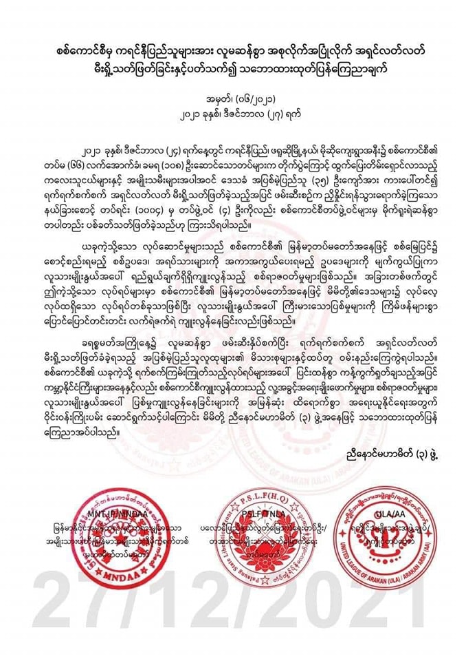ကရင်နီပြည် စစ်ဘေးဒုက္ခသည်တွေကို စစ်ကောင်စီက အရှင်လတ်လတ် မီးရှို့သတ်တဲ့ပြစ်မှုကို ကမ္ဘာ့နိုင်ငံကြီးတွေ အမြန်ဆုံး ထိရောက်အောင် အရေးယူပေးဖို့ ညီနောင်မဟာမိတ်သုံးဖွဲ့ MNDAA/TNLA/ AA အဖွဲ့တို့က ဒီဇင်ဘာ ၂၇ မှာ တိုက်တွန်းထုတ်ပြန်ခဲ့ပါတယ်။