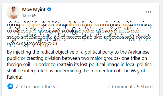 ကိုယ့်ရဲ့ တိမ်မြုပ်လုနီးပါးနိုင်ငံရေးပါတီတစ်ခုကို အသက်သွင်းဖို့ အရှိန်ကောင်းနေတဲ့ ခရီးတစ်ခုကို ရပ်တန့်စေဖို့ နယ်မြေနှစ်ခုထဲက ရခိုင်တွေကို ရယ်ဒီကယ် အယူဝါဒကိုသိမ်းသွင်းပြီး ခွဲဖို့ကြိုးစားတာဆိုရင် ဒါက ရက္ခိတလမ်းစဉ်နဲ့ ကိုက်ညီ မညီ မေးခွန်းထုတ်ကြမှာပါ။